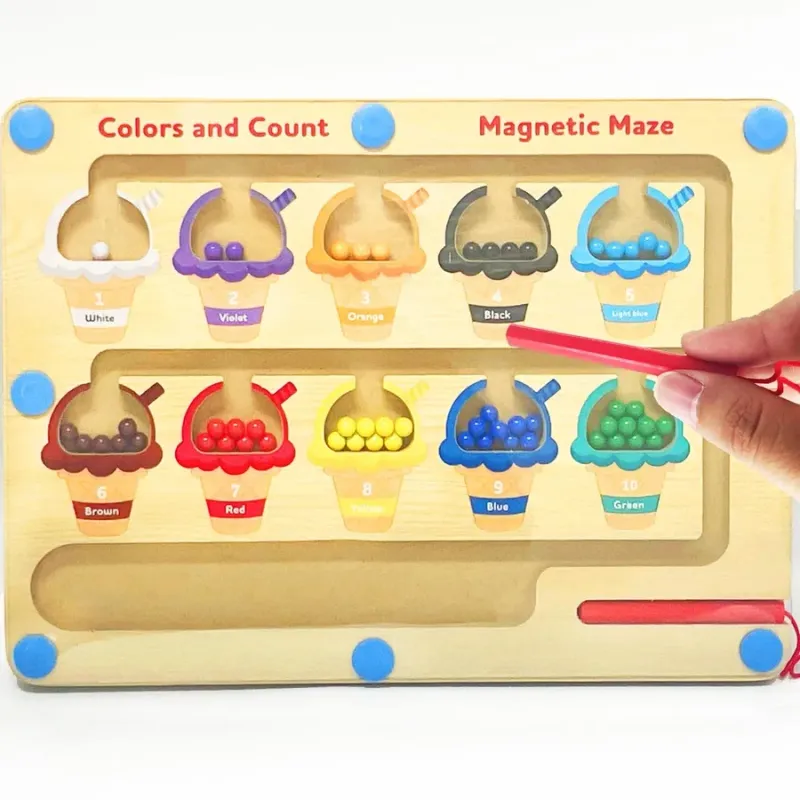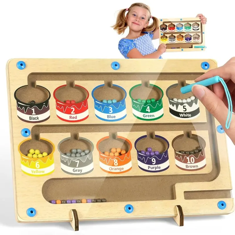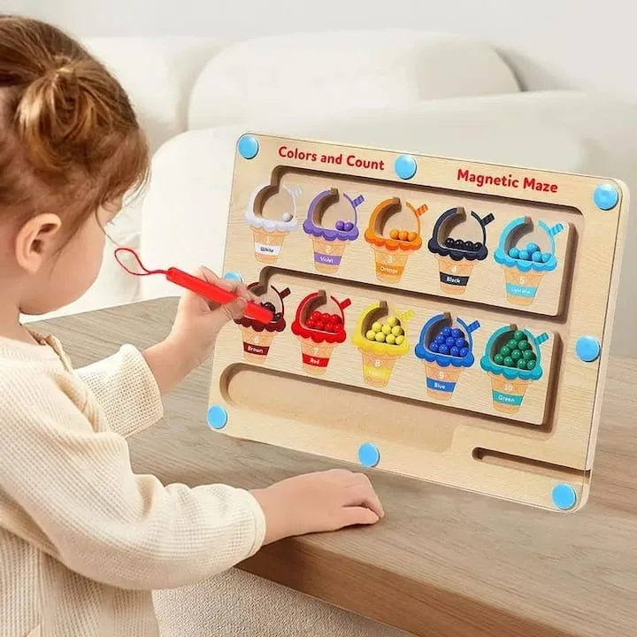 1️⃣ الطفل يمسك القلم الممغنط. 2️⃣ يحرك الكرات من المسار لحد السلة اللي نفس اللون. 3️⃣ يتعلم يعد الكرات ويتأكد إن العدد صح. 4️⃣ يربط بين الألوان + الأرقام بطريقة ممتعة.